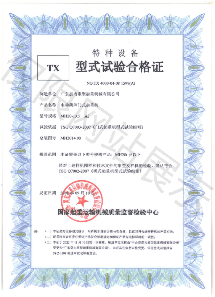 特種TX型式試驗(yàn)合格證--電動(dòng)葫蘆門式起重機(jī)