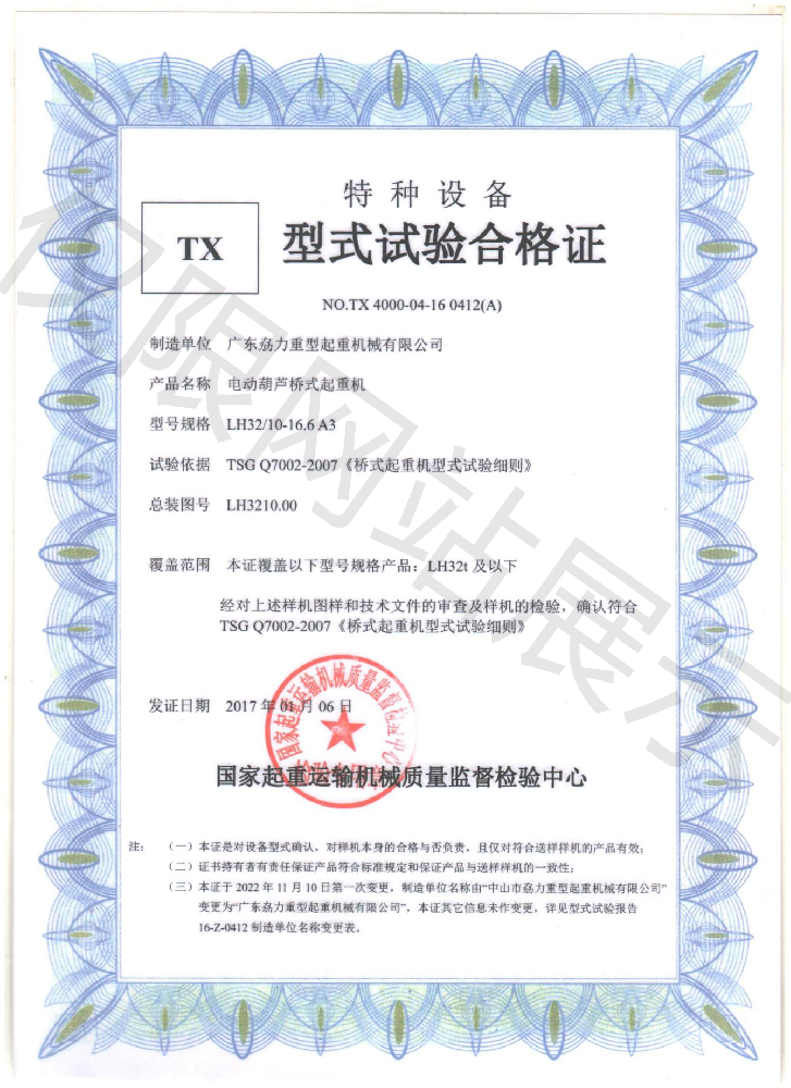 特種TX型式試驗(yàn)合格證--電動(dòng)單梁懸掛起重機(jī)