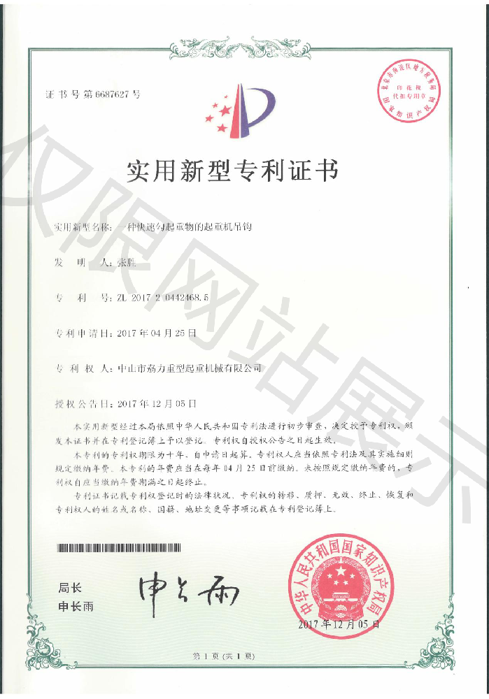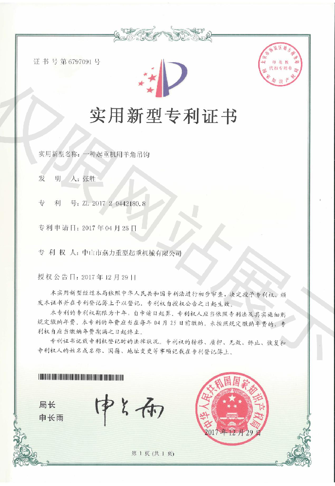 實(shí)用新型專利證書(shū) -- 起重機(jī)用羊角吊鉤