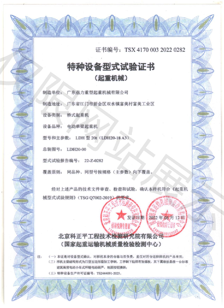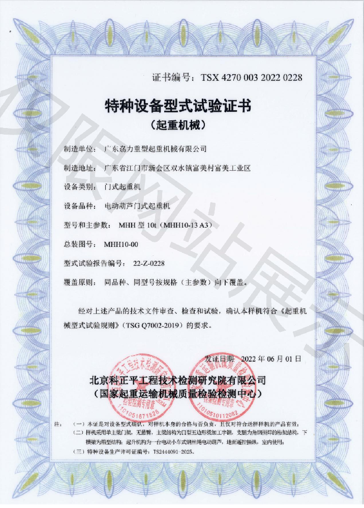 特種設(shè)備型式試驗(yàn)證書(shū)--電動(dòng)葫蘆門(mén)式起重機(jī)