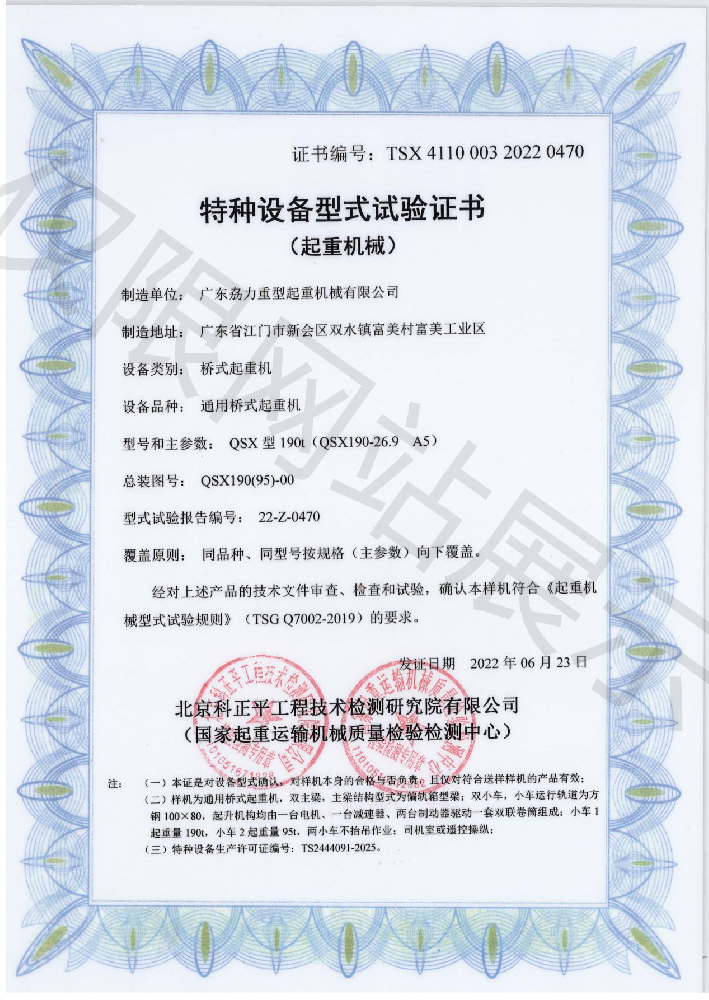特種設(shè)備型式試驗(yàn)證書(shū)--通用橋式起重機(jī)